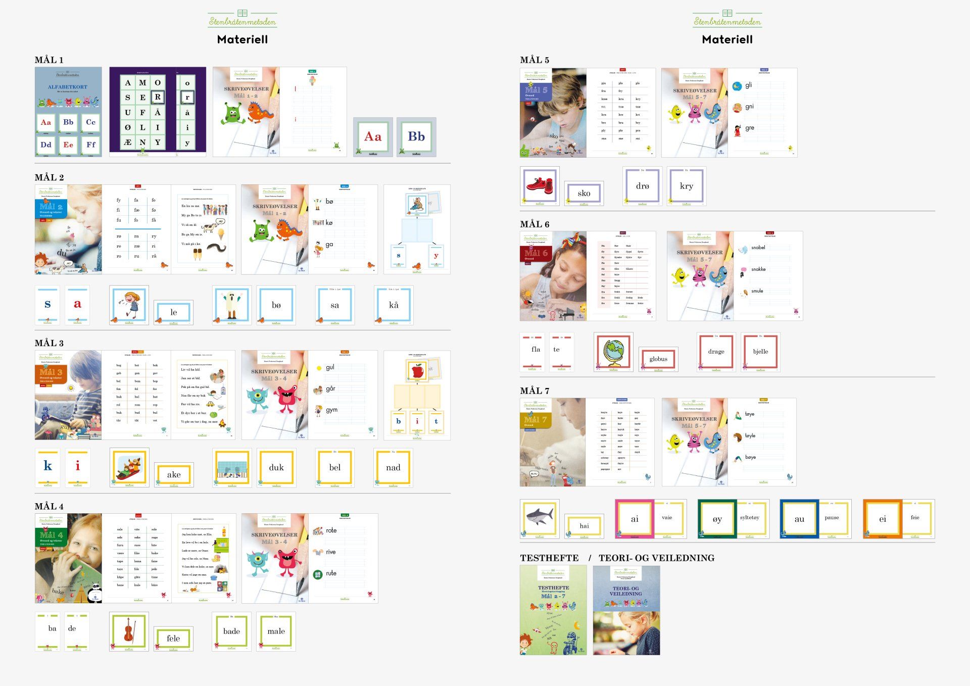 Alt av det trykte materiellet til metoden er designet av Milla. Lesekoffert med innhold, lese- og skrivehefter samt en teori- og veiledningsbok.